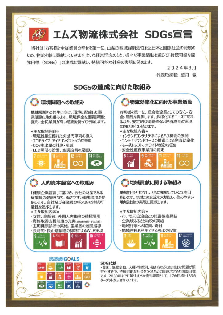 ため、物流を軸に貢献していきます」という経営理念のもと、様々な事業活動を通じて「持続可能な開発目標(SDGs)」の達成に貢献し、持続可能な社会の実現に努めます。とのSDGs宣言を行ないました。